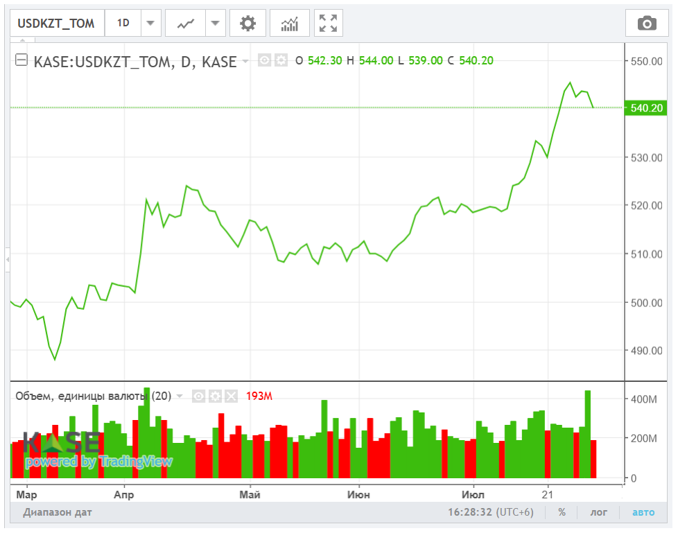 Обзор рынков подготовили аналитики Ассоциации финансистов Казахстана (АФК). Валютный рынок В четверг предложение инвалюты значительно превысило спрос на нее, что могло быть обусловлено продажей долларов субъектом КГС и интервенциями Национального банка для снижения волатильности на валютном рынке. Так, по итогам торгов курс по паре USD/KZT составил 540,72 тенге за доллар (-5,48 тенге) при низком объеме торгов – 193,0 млн долларов (-250,7 млн). Низкая торговая активность может быть связана с отсутствием ожиданий роста курса вследствие интервенций НБРК, удовлетворением повышенного спроса, выжидательной позицией участников рынка перед публикацией объемов продаж инвалюты из Нацфонда в текущем месяце и в рамках операций по зеркалированию покупок золота. Кроме того, сегодня будут опубликованы данные об изменении инфляции за июль, которые окажут определяющее влияние на дальнейшую динамику монетарных условий в стране. Диаграмма 1. Курс по паре USD/KZT: Денежный рынок Доходности денежных инстру