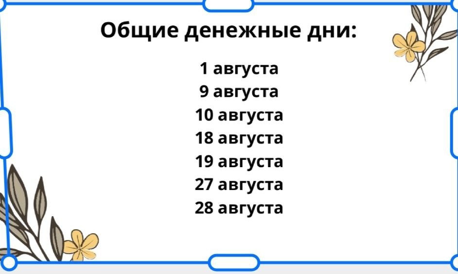 🦋 ДЕНЕЖНЫЕ ДНИ В АВГУСТЕ 💌 💐 1, 9, 10, 18, 19, 27, 28 💐 — дни, когда лучше всего привлечь финансы! ✨ Сохраните этот список и следуйте простым рекомендациям, чтобы активизировать денежный поток. Правила практики привлечения денег: 1. Нарисуйте цифру 9 ✏️ Действуйте осознанно и легко. Главное правило: рисовать с хорошим настроением и радостью. Цвет выбираем любой — подойдет даже простой карандаш или ручка. 2. Место нанесения цифры: Правши наносят символ на левую руку, левши — на правую. 3. Важная фраза: Произнесите вслух или мысленно фразу: «Кодирую себя на деньги!» Можно добавить желаемую сумму, но это необязательно. 4. Срок активности: Оставляйте рисунок на руке до конца дня. Смывать сразу не рекомендуется, если не хотите прервать магию притяжения финансов. Что ожидать? Результат может проявиться неожиданно: возможно получение премии, выигрыша, неожиданного дохода или интересного делового предложения .
