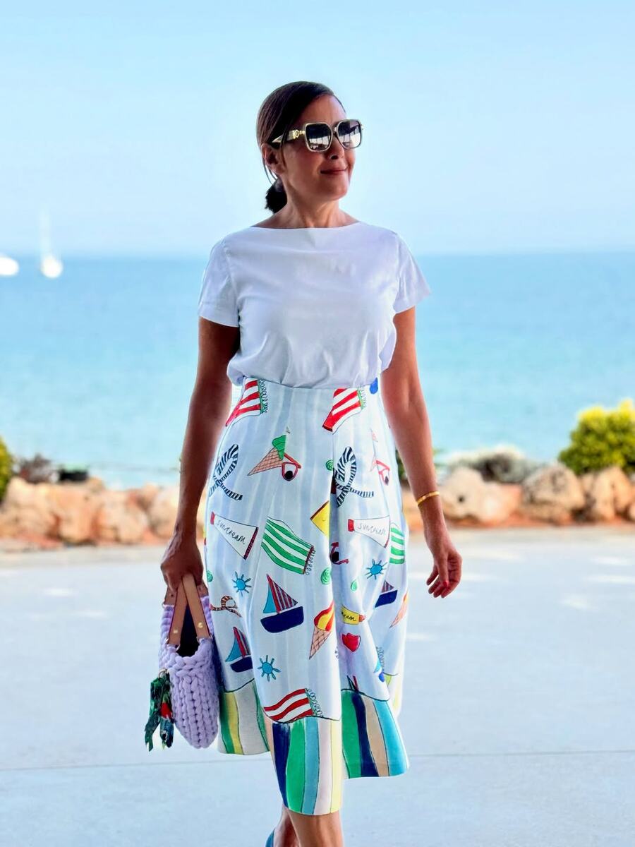 Иногда достаточно одной детали, чтобы образ заиграл — и не важно, сколько вам лет, 35 или 65. Женщинам старше 55 часто внушают, что стиль — это дорого, сложно и требует смелости. Но правда в том, что шикарно выглядеть можно и без радикальных изменений гардероба. Главное — знать несколько стилистических приёмов, которые освежают, украшают и при этом не выдают усилий. На этих образах — живые примеры: как с помощью цвета, фактуры и грамотной сборки можно выглядеть достойно, уверенно и современно. Без брендов, без глянца, без давления. Вот на что стоит обратить внимание: 1. Белая база и яркие детали Белоснежная хлопковая блузка + пёстрая юбка миди с рисунком парусов — отличный летний тандем. Простота верха компенсируется активностью низа, а такой приём помогает зрительно вытянуть силуэт и освежить лицо. Не пропустите акцент — массивная вязаная сумка с цветным платком: недорогой способ добавить индивидуальности. 2. Минимум макияжа — максимум аксессуаров Крупные очки, аккуратная укладка, у