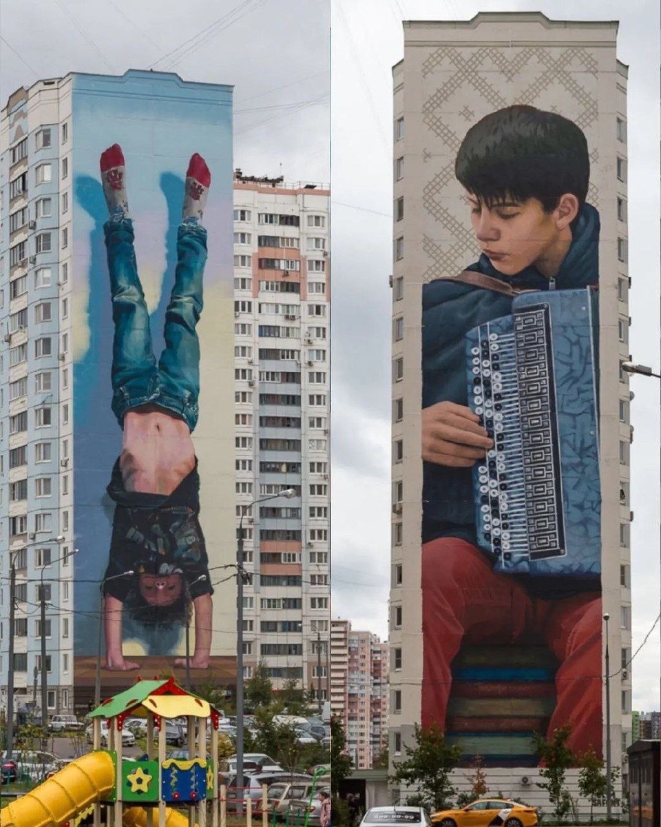 Многоэтажки как холсты: грандиозное уличное искусство Новой Трёхгорки. Идеолог фестиваля стрит-арта «Урбан Морфогенезис» Дмитрий Лёвочкин несколько лет вынашивал в голове идею о том, как превратить родное Одинцово в яркую точку на российской карте. В 2019 году в Одинцово съехались мастера стрит-арта из 26 стран мира, а полотнами для их домов стали глухие фасады многоэтажек. Так в Новой Трёхгорке появилось уникальное пространство, которое местные жители прозвали музеем граффити под открытым небом. Чтобы осуществить задуманное, художникам понадобилось 20 000 литров краски, авторы приступили к работе в июле, а закончили в сентябре. Самое больше полотно — 60-метровый портрет Юрия Гагарина. Фото, видео: nuta_ch, moscow_stowok, @don_ru