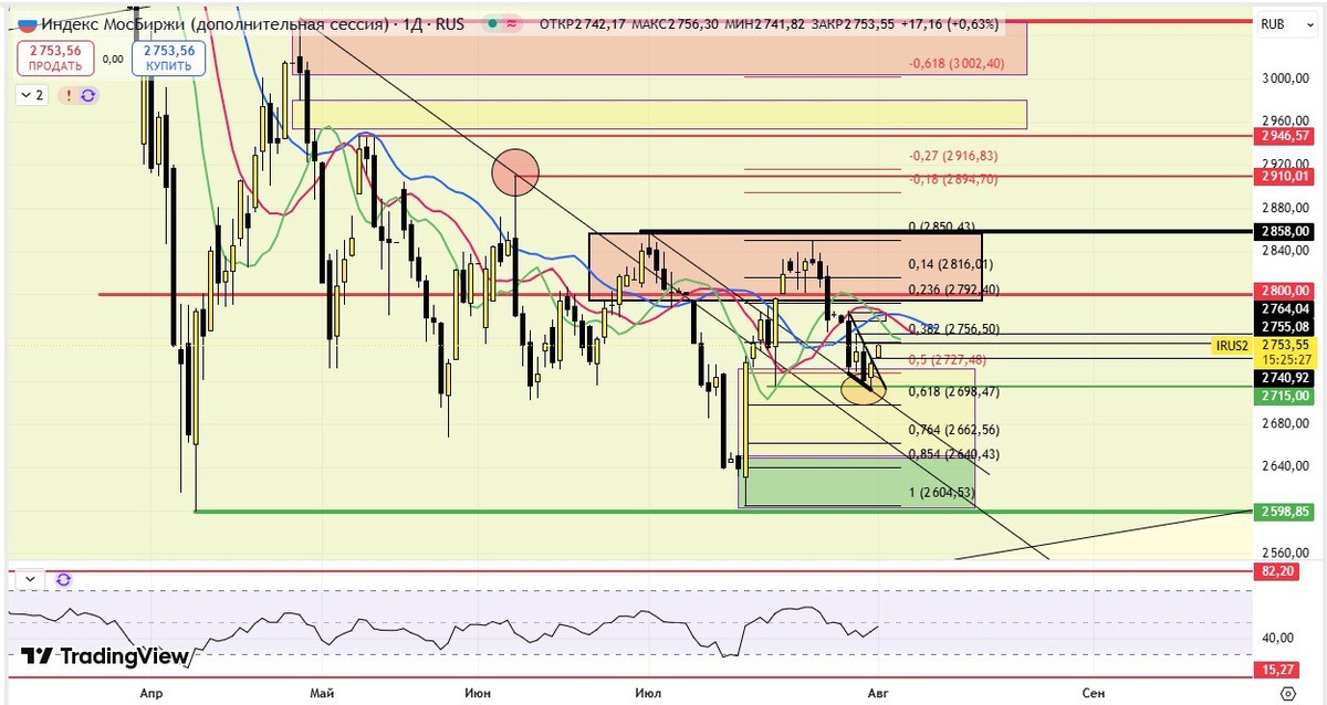 🏦 #Индекс_ММВБ ТФ 1Д, 4н Трамп сдаётся, признав, что введенные против России санкции, вряд ли окажут на неё какое-то влияние. Наконец-то до него дошло. А попытки ввести вторичные санкции на торговых партнеров России, тоже пока не увенчались успехом. Как оказалось, их не испугались ни Китай, ни Индия. Индия слегка "виляет", но даже если и подпишет какое-то соглашение, то вряд ли будет его исполнять. Цены на нефть торгуются на очень комфортном для нефтеэкспортеров уровне, в районе 72 долларов за бочку. ВТБ вчера прояснил ситуацию по "допке", определив количество акций и примерную сумму, которую получит. Некоторые "торопыги" быстро посчитали цену размещения в 73 рубля, но руководство ВТБ заявило, что это слишком упрощённый подход и ВТБ будет стремиться продать бумаги по максимальной цене и еще не факт, что все акции. Официально с ценой размещения банк собирается определиться в сентябре. 📈 Что по ТА? Вчера Индекс чисто символически, на пару пунктов, обновил минимум от 18 июля, отскоч