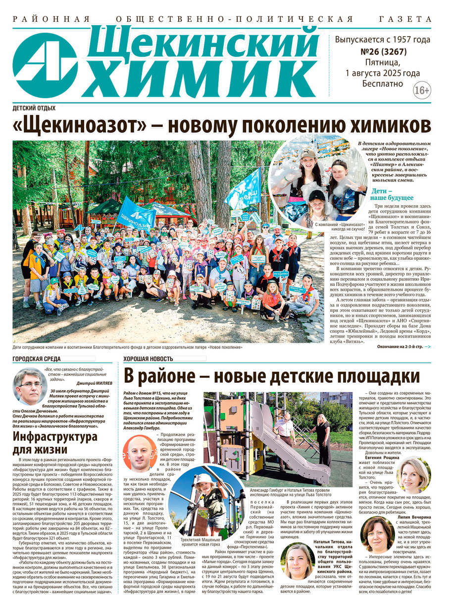 Последний месяц лета для щекинских химиков начинается с праздника – 3 августа профессиональный праздник отмечают железнодорожники предприятия! Об этом и многом другом, интересно и полезно – на страницах «ЩХ». ✨ В этом номере: – Один из старейших профессиональных праздников в России – Счастливые дети – инвестиции в будущее! О летнем отдыхе в лагере «Новое поколение» – Как ни отдыхай, а школа – близко! Район готовится к новому учебному году – интервью с председателем комитета по образованию МО Щекинский район Сергеем Зиновкиным – Парадоксы демографии в материале экономического обозревателя Александра Савенкова – Вакансии в компании «Щекиноазот» И другое. 📮 Распространяется газета бесплатно! Адреса - в комментариях. 📎 Есть новости? Редакция – на связи: +7(48751) 9-28-98, konik@azot.net.