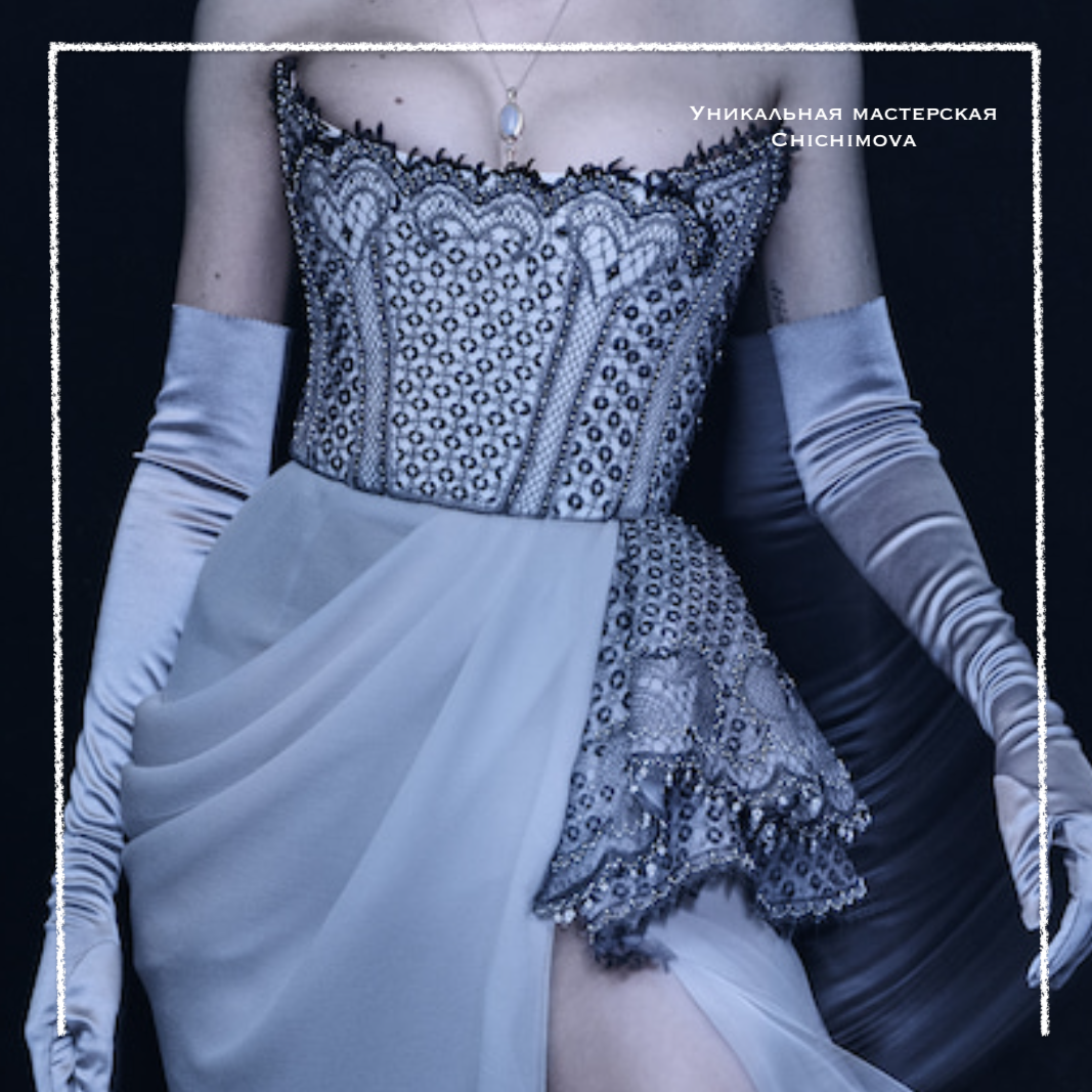 Например, это шелковое платье дымчатого цвета с корсетом и асимметричной баской, выполненными из елецкого кружева расшитыми речным жемчугом.