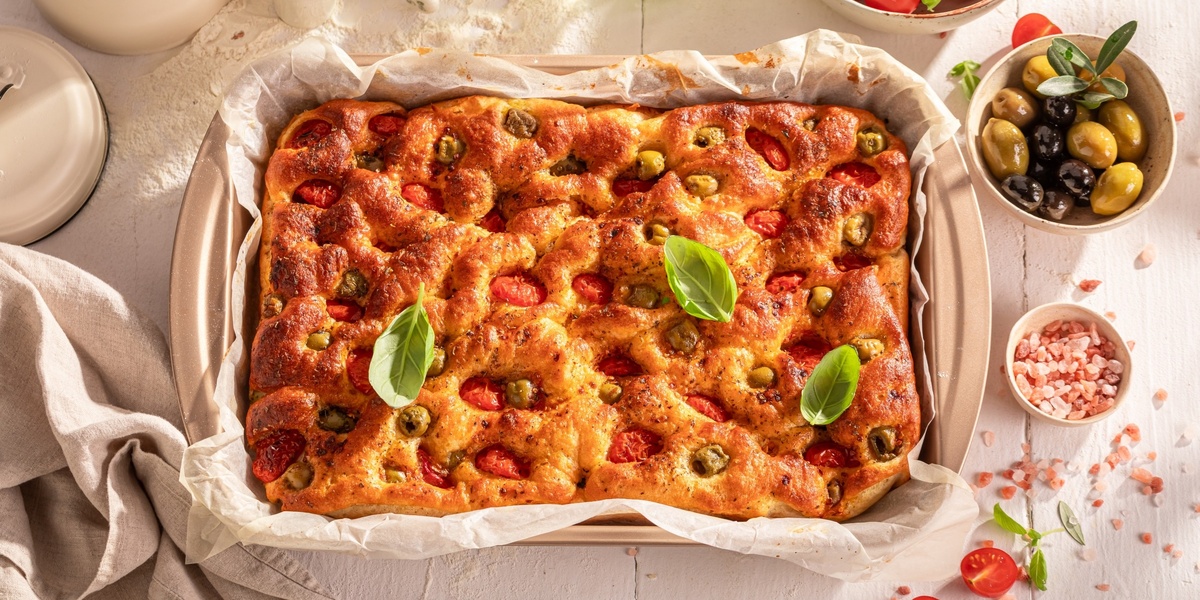Фокачча — это ароматная итальянская дрожжевая лепёшка с хрустящей корочкой и нежной, воздушной сердцевиной. Её можно подавать как закуску, гарнир или основное блюдо — с сыром, ветчиной, овощами или просто с оливковым маслом. А эта версия с помидорами черри и оливками получается особенно сочной, красивой и праздничной.