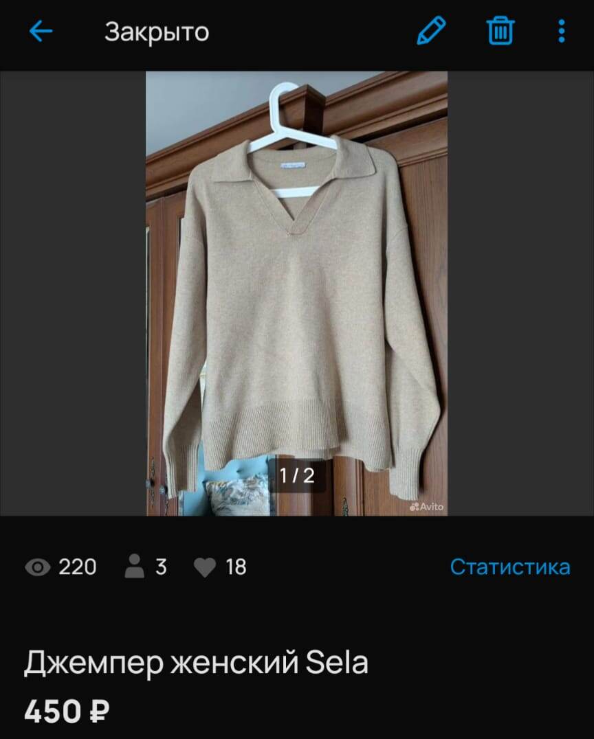 Джемпер Sela. Как всегда, хорошее качество и современный дизайн. Эти вещи обычно хорошо покупают. Продан за 450 рублей.