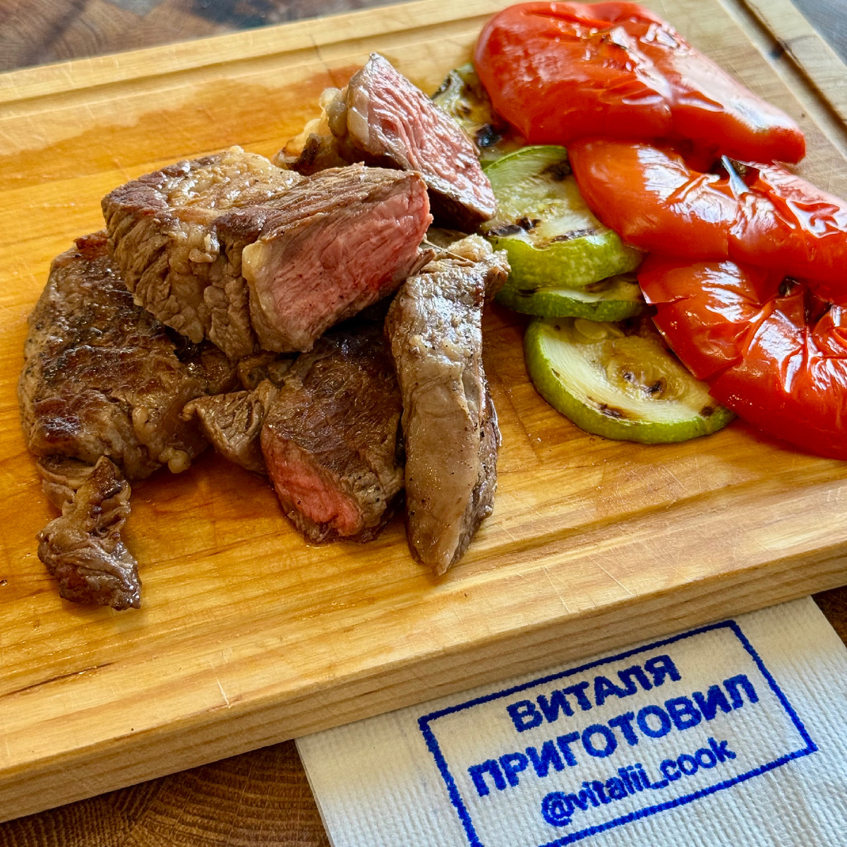 Стейк на гриле с овощами Нам потребуется: 🥩 Стейк Чак ролл 260 гр 🥩 Кабачок 6 слайсов 🥩 Перец болгарский 1 средний 🥩 Соль по вкусу 🥩 Черный молотый перец по вкусу 🥩 Масло сливочное 20 гр Недавно у меня появился новый гриль с возможностью раскрытия на 180 градусов и я решил приготовить стейк с овощами. В этот раз готовил стейк чак-ролл, обжаривал его сначала по 1,5 мин с каждой стороны при 230 градусах, а потом довел до готовности периодически переворачивая. Готовность определяйте самостоятельно, все любят стейки разной прожарки. После переложил стейк на фольгу, присыпал солью и черным молотым перцем, сверху положил кусочек сливочного масла. Завернул поплотнее и дал отдохнуть 5 минут. По овощам все стандартно: кабачок и перец обжарил с двух сторон до мягкости. А какой прожарки вы любите стейки?