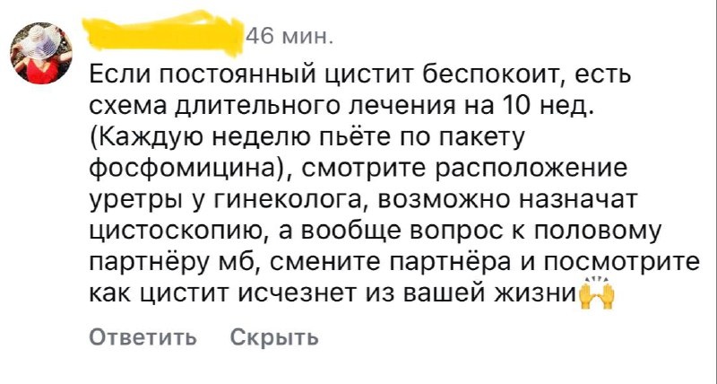 Разбор совета из комментария 🔹Схема приема Монурала off-label, и решаться на нее можно при соблюдение как минимум двух больших условий, за это несет ответственность врач • Речь идет о лабораторно подтвержденном цистите - в моче повышаются лейкоциты, результаты бак посева мочи - не подтверждает диагноз - иначе речь идет о тазовой боли • Выстроена, но безуспешна комплексная терапия - проведен должный курс иммунопрофилактики, адекватный курс по восстановлению кислотности интимной зоны и по показаниям, местная гормональная терапия, а также, по показаниям, взяты под контроль мышцы в тазу, на оценку эффекта заложено минимум 3 месяца ——— Какой эффект от этой терапии мы ждём, честно говоря непонятно, поэтому и off-label ——— 🔹Расположение уретры смотрим не у гинеколога, а только у уролога, с обязательно корректно выполненным Qtip тестом с оценкой подвижности последней 🔹Цистоскопию могу назначить только при соблюдение самого первого пункта или подозрение на поражения интерстиция (интерст