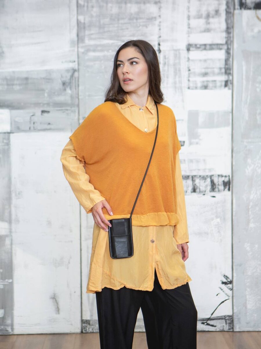 Первый слой — блуза из 100% жатого шёлка от PRAECHTIG BERLIN. Тёплый жёлтый оттенок добавляет мягкого сияния образу, а свободный удлинённый силуэт делает модель универсальной: её легко стилизовать и как самостоятельную вещь, и как часть многослойного комплекта.
