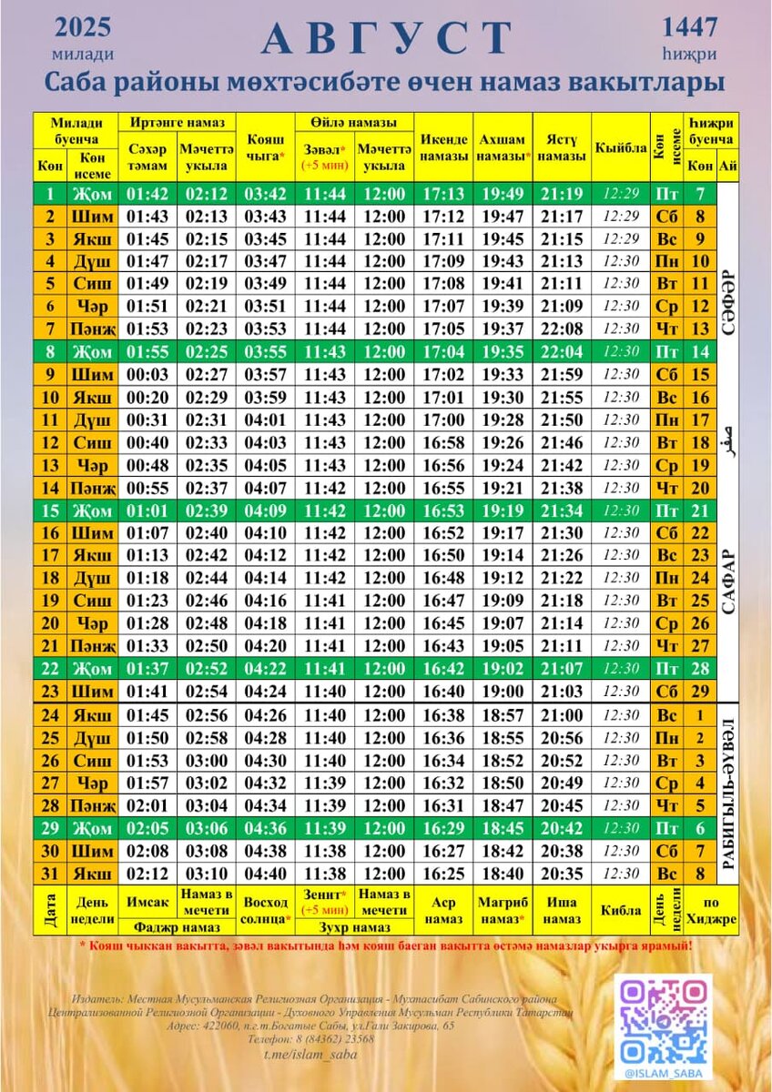 ☪️Саба мөхтәсибәтенең август аена намаз вакытлары