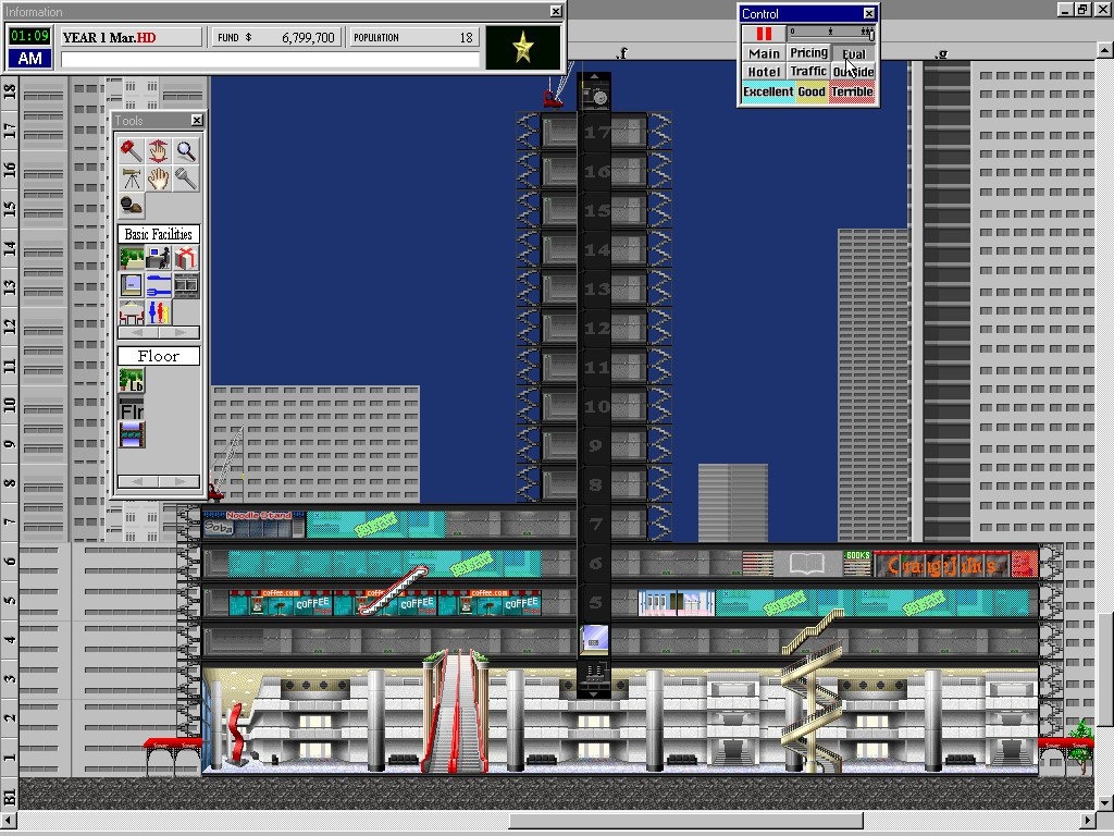 Стратегия Yoot Tower в браузере Всем привет. Закончился мой отпуск и я снова приступаю к работе над новыми играми. Начнем с малого, для разгона так сказать. Держите экономическую стратегию Yoot Tower про строительство небоскребов и других высоток. Эта игра идейная наследница знаменитого SimTower, которая во многом лучше своего прародителя. И кстати одна из немногих игр на DosZone, которая потребовала от нас эмуляция Windows 98. Поиграть можно здесь 🕹