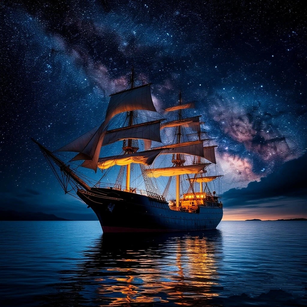 Сияющий корабль под тёмным звездным небом, сказочная атмосфера, вода