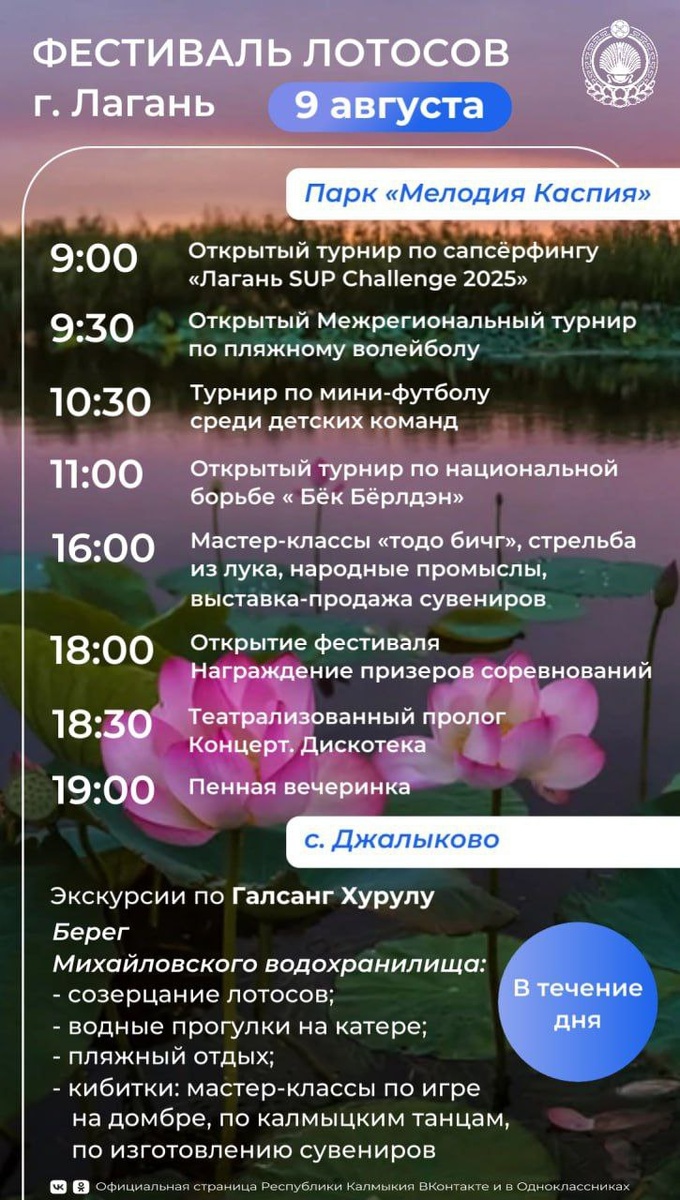 Лотосовая сказка Калмыкии в разгаре! 🪷 #места_юга #Калмыкия В селе Джалыково уже вовсю цветут удивительные лотосы — с середины июля и до середины августа посреди водных просторов раскрывается это природное чудо! 9 августа в Лагани состоится традиционный Фестиваль лотосов-2025 — красочное событие, посвященное цветению этого удивительного цветка. Праздник пройдет одновременно в Лагани и Джалыково. В программе фестиваля: спортивные состязания, культурные мероприятия, выставки и мастер-классы, прогулки по лотосовым полям. Но главное действо — это созерцание самих лотосов, символа чистоты и просветления, которые поднимаются над мутной водой и распускаются в безупречной красоте. С 2017 года в Лаганском районе Калмыкии проводят Фестиваль лотосов, и с каждым годом желающих увидеть это природное чудо становится всё больше! 🌸 Подписаться | ПРО ЮГ