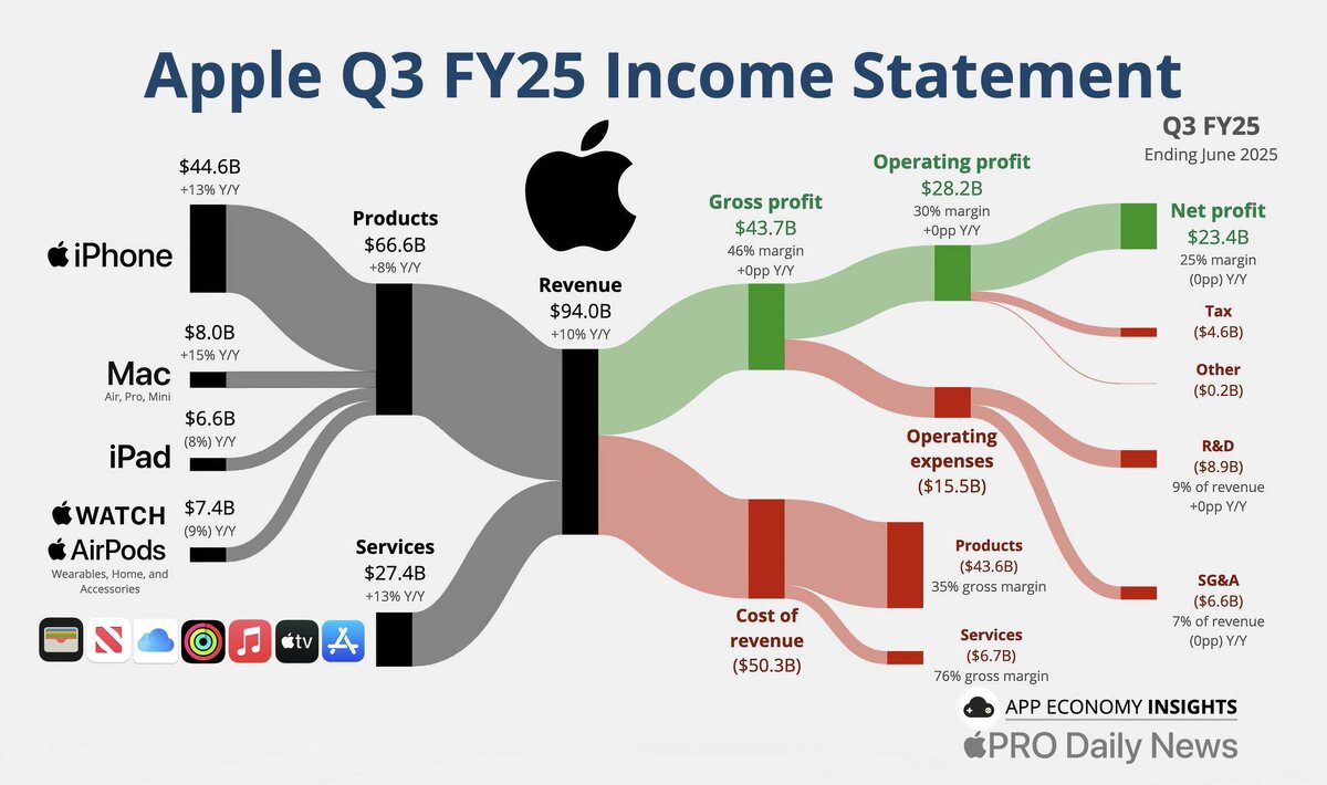 Apple опубликовала отчёт за третий финансовый квартал 2025 года: Выручка за Q3 2025 составила $94 млрд (+10% против Q3 2024). Разбивка по категориям: • iPhone: $44,6 млрд (+13,5%) • iPad: $6,6 млрд (-8%) • Mac: $8 млрд (+14,8%) • Носимые устройства, аксессуары и Умный дом: $7,4 млрд (-8,6%) • Сервисы: $27,4 млрд (+13,1%) Наибольший прирост прибыли от продаж – до 25%, в азиатском регионе. Показатели услуг и сервисов в очередной раз достигли рекордно высокого уровня. Получена прибыль на акцию в размере $1,57 (+12%).