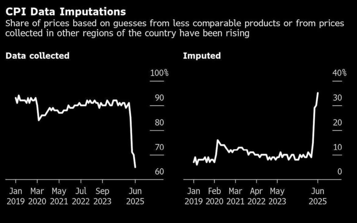 В ответ на пост CPI? Не инфляция, это фанфик 📉 В июне BLS собрал всего 63% реальных цен. Остальное, это просто дорисовали по шаблону из других регионов. С тех пор как они «обновили» методологию, доля выдуманных данных только растёт. 🎁 То есть, цифры берутся не с рынка, а из головы, точнее из чужой головы, по принципу «ну, там вроде так было, пусть будет и тут». Так что, когда тебе в новостях говорят: «инфляция под контролем», уточни, чья именно реальность под контролем...