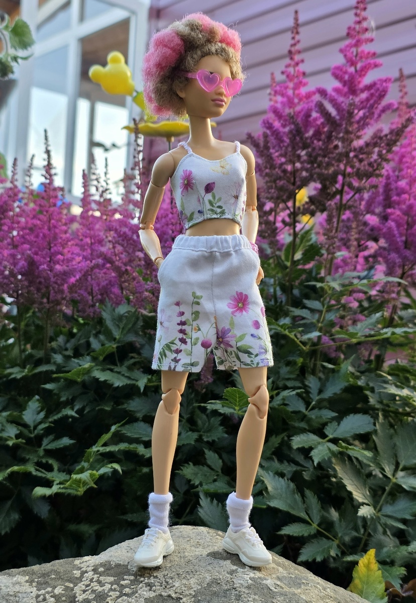У меня опять случилось внеочередное дачное включение. Сшился простенький комплект одежды в цветочек, и началась эпопея с моими терзаниями: кто и куда в нём пойдет. Победила Анфиса. Поняла что нужна максимально розовая кукла для этого комплекта, а эту роль исполняет в коллекции только Мбилли - барабанщица. Подобрала браслет и очки из запасов, а прическа у неё врожденная, тут и думать не надо) Сначала собиралась ехать в поле, но в итоге всё случилось на дачный клумбах. Решила, что если уж розовый, то по максимуму, а в полях сейчас иные краски. ( В поле потом мы тоже прокатились, но Анфиса так и не вылезла из рюкзака) Мы с Анфисой тщательно проинспектировали все цветущие на данный момент растения, и заодно некоторые садовые украшения, которые еще не попадали в кадр. Цветы необязательно розовые, но Анфиса все равно попала в настроение. А потом нашлось то самое, ради чего Анфиса пришла на дачу, только ни я, ни она об этом не подозревали) Это астры. Теперь стало очевидно, что Анфиса аб