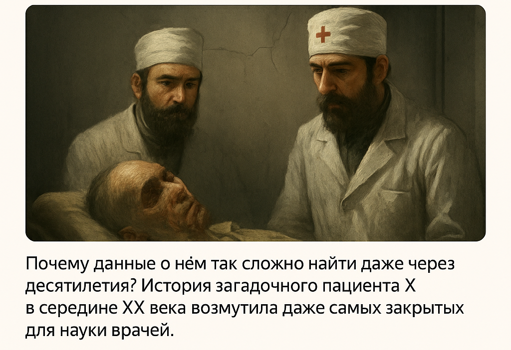 Он не говорил, не помнил своего имени и, казалось, не был человеком вовсе. Его тело — смесь ожогов, переломов и невозможного выживания. Кто он — Пациент Х, о котором молчит советская медицина? Летом 1953 года в одну из московских закрытых клиник доставили мужчину в состоянии, которое не поддавалось медицинской логике. Ни документов, ни свидетельств, ни даже уверенности, что он — гражданин СССР. Его нашли у железнодорожной ветки под Тулой: изуродованный, без сознания, с почти обугленным телом, но живой. Он был весь в бинтах. Его лицо напоминало расплавленную маску, одна рука была вывернута назад, на теле — странные ожоги, не похожие на термические или химические. При этом — ни следов радиации, ни поражения тканей, характерного для кислот. Легенды внутри клиники называли его не иначе как Пациент Х. Пациент не разговаривал. Ни на русском, ни на других языках. Даже не мычал — только издавал хриплые звуки, похожие на код или морзянку. Один врач предположил, что это следствие сильной травмы