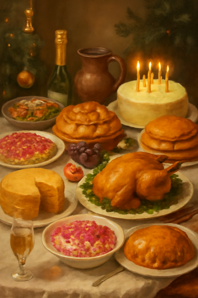 Каждое торжество в России — будь то Новый год, Рождество, свадьба или день рождения — немыслимо без богатого стола, на котором обязательно присутствуют традиционные русские блюда. Праздничная кухня в России всегда была не только средством утоления голода, но и важным элементом культурных обычаев и обрядов. В этой статье мы исследуем, какие блюда ассоциируются с русскими праздниками и какие символы они несут. Новый год: стол, полный символов 🎄🍾 Новый год — это, пожалуй, самый ожидаемый и любимый праздник в России, и его застолье всегда пышное и многообразное. Среди традиционных новогодних блюд — салат «Оливье», селедка под шубой, хрустящие закуски, мясные блюда, а также разнообразные десерты. Салат «Оливье» стал неотъемлемой частью новогоднего стола в России. Его история восходит к XIX веку, когда в ресторане «Эрмитаж» московский повар Люсьен Оливье предложил его как экстравагантное блюдо для аристократов. Сегодня же «Оливье» стал традиционным блюдом, которое готовят не только в празд