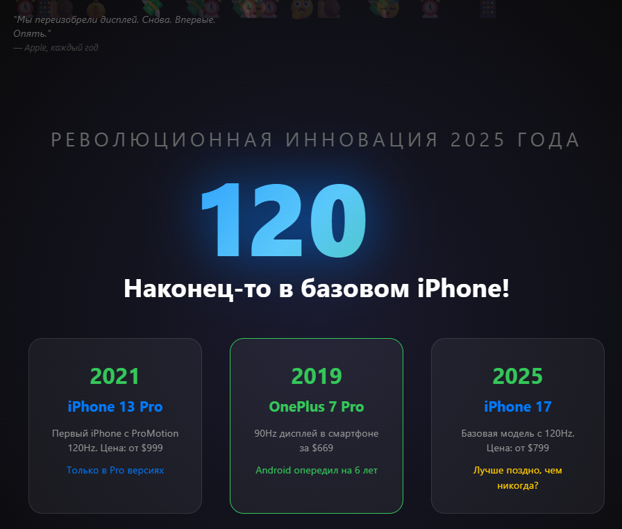 До презентации iPhone 17 осталось два месяца. Собрали все утечки и слухи о новой линейке: от ультратонкого iPhone Air до 120Hz экранов в базовых моделях. Рассказываем, что изменится, сколько будет стоить и стоит ли ждать. Apple решила отказаться от модели Plus, которая продавалась хуже всех в линейке. Вместо неё появится iPhone 17 Air — ультратонкая версия, которая, по слухам, будет самой дорогой в линейке (около $1299), но не самой производительной. Что получаем: Самое главное обновление базовых моделей — LTPO OLED дисплеи с частотой обновления 120Hz. Apple добавит эту технологию во все модели линейки, включая базовый iPhone 17. Что это значит: Для сравнения: ProMotion появился в iPhone 13 Pro в 2021 году. Android-смартфоны получили 90-120Hz экраны еще в 2019. Фронтальная камера во всех моделях: Основные камеры в Pro-моделях: iPhone 17 Pro/Pro Max получат: Базовые модели: Процессоры: Память: Другое: Все модели получат поддержку Apple Intelligence, но в России эти функции работать не