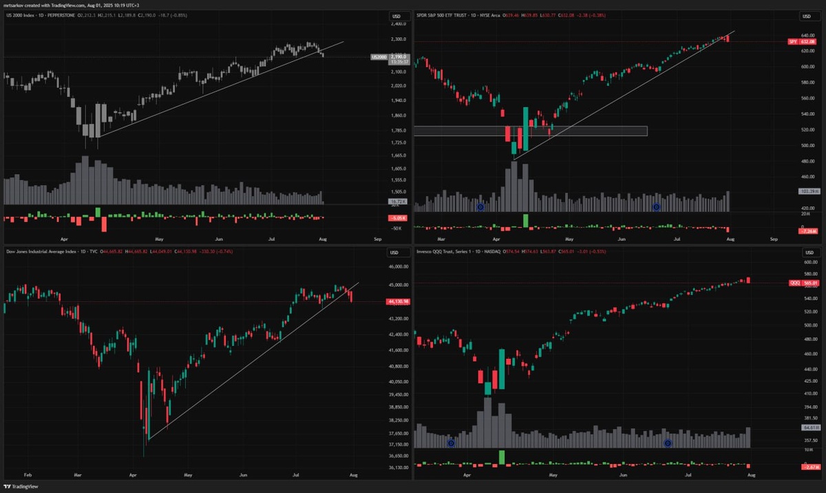 #аналитика 🇺🇸Американский рынок Сегодня чувствует себя вяло - коррекция плавно продолжается. Август, ровно как и начало слабого периода для рынка, начался резко. Посмотрим, как сегодня закроется рынок. Это будет подсказкой на его динамику в ближайшие неделю-две 🔪