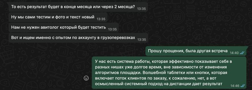 _______________________________ Меня зовут Арсений Демидов, я владелец маркетингового агентства “ПРОДВИГАЙ”. У нас есть крутой телеграмм канал и сообщество VK, там публикуем гайды, инструкции и полезные фишки про Авито и новости e-com рынка России. Но главное - мы помогаем бизнесу зарабатывать на Авито. В 2024 году наши клиенты продавали в среднем на 30+ млн рублей ежемесячно и продолжают это делать в 2025. _______________________________ И это понятно… Но не мы установили правила «игры» - действительно успешный бизнес строится годами. Это сухая статистика. Маркетинг - часть бизнеса и тут действуют те же правила. На скриншоте конец диалога с потенциальным клиентом, мы честно рассказали, что в рекламе гарантий нет, но есть наш опыт, насмотренность, система работы. Компания не стала нашим клиентом, и это нормально. Но вот что мы хотим донести: нельзя нажать на кнопку и запустить поток лидов или продаж. Это всегда результат тестирования определенных гипотез, применения различных подходов.