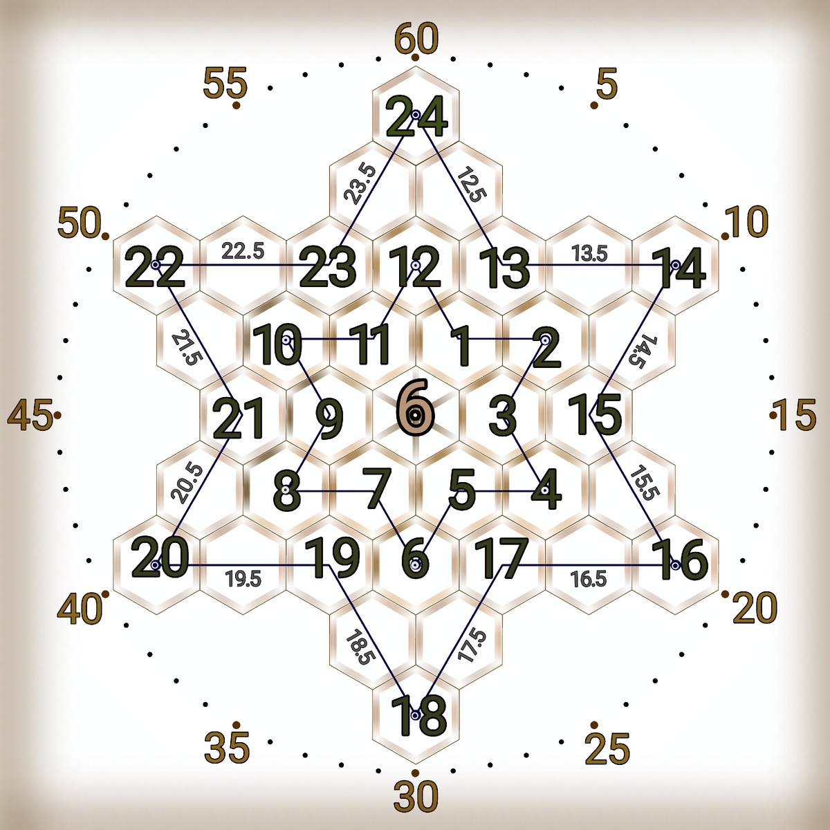 Если соединить 24 ячейки по часовой стрелке, последовательно пронумеровав их, мы увидим, как из структуры сот прорисовываются две шестиконечные звезды.