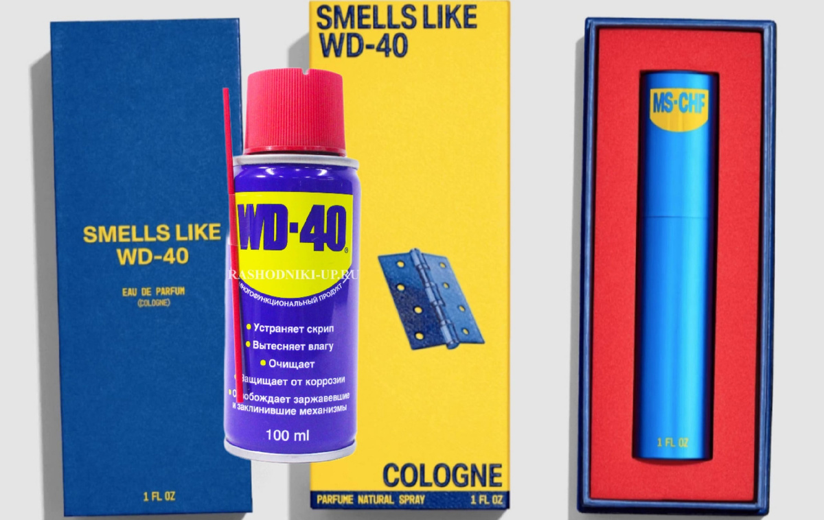 Smells Like WD-40 MSCHF- аромат про моторное масло и ванилин. Пахнуть как WD-40, как это? ВД-40- универсальная техническая смазка, на 50 % состоящая из уайт-спирита.