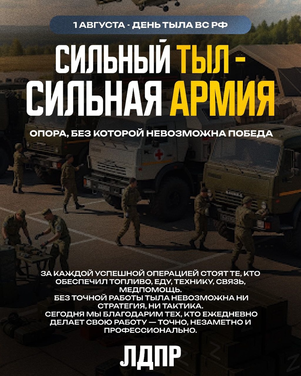 🇷🇺1 августа - День тыла Дорогие ветераны и труженики тыла! Поздравляем вас с Днём тыла! Этот день — дань уважения и благодарности всем тем, кто в тяжёлые времена проявил мужество, стойкость и самоотверженность. Вы стали опорой для фронта, поддерживая его своим трудом и заботой о близких. Ваши усилия и героизм помогли нашей стране выстоять и победить. Мы благодарны за ваш вклад, за все жертвы и лишения, которые вы перенесли ради общего блага. Пусть каждый день приносит вам радость, здоровье и счастье. Мы ценим и помним ваш подвиг, который навсегда останется в наших сердцах. В этот день также хочется выразить огромную благодарность всем волонтёрам и неравнодушным людям, которые помогают воинам СВО! Ваша поддержка очень важна. Вместе - Победим💪 С праздником вас!