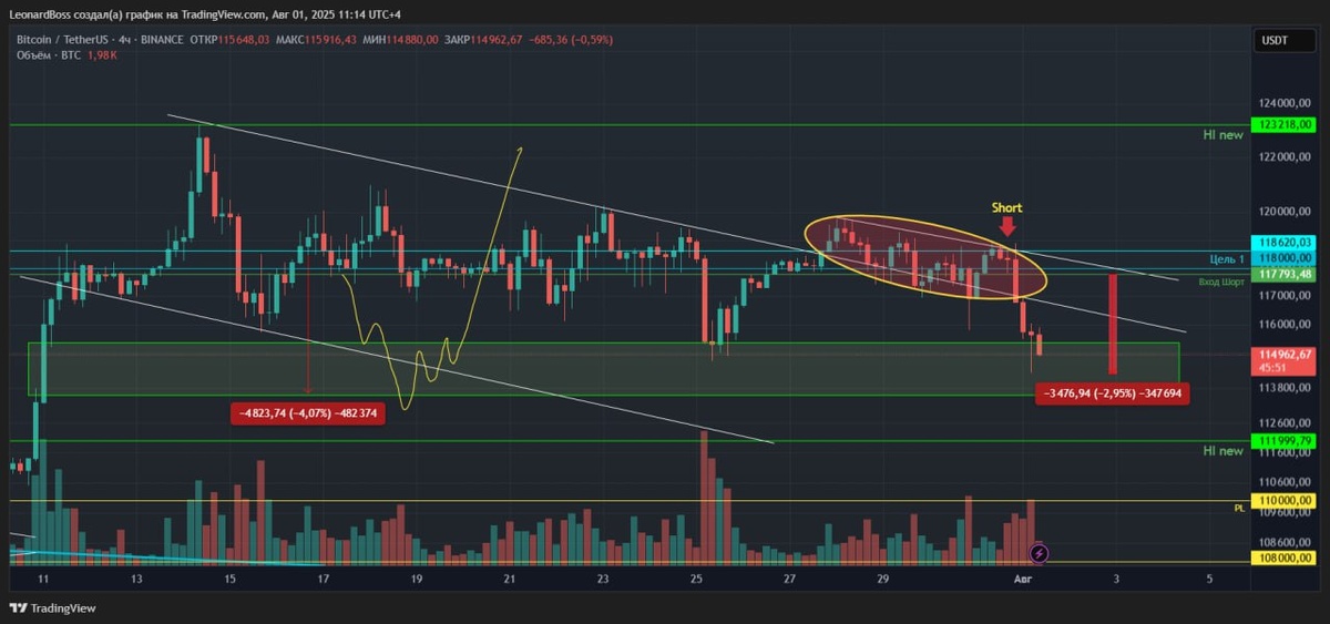 В ответ на пост #BTC 🕯Локально🕯 Приветствую, коллеги!! Выпал вчера из эфира в виде очередных долгих передвижений. Рассмотрим локальную картину по BTC, а после разберем глобальный ТА сценарий с учетом закрытия месяца, всех с 1м августа!!) ⚠️С последнего локального разбора BTC, 3 дня назад, где был выход графика выше трендовой, мы наблюдали локальный боковик с небольшим снижением вдоль трендовой, который в большинстве случаев приводит к продолжению роста, короткий импульс которого наблюдался в конце боковика, но который также оказался ложным, как и весь выход на трендовую!! ⚠️На самом деле ничего удивительного или неожиданного на графике BTC мы не увидили. О большой вероятности закрытия (притяжении цены) GEPa снизу, мы все знали (говорил об этом в самом начале обновления HI) на протяжении всего боковика. Как видит, всё же именно в эту зону цена и пришла, а предыдущей тенью перекрыла больше половины дыры, что уже можно считать выполнением условия для разворота!! P.s. 2й график дневн