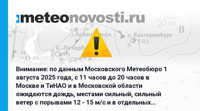 Внимание: по данным Московского Метеобюро 1 августа 2025 года, с 11 часов до 20 часов в Москве и ТиНАО и в Московской области ожидаются дождь, местами сильный, сильный ветер с порывами 12 - 15 м/с и в отдельных районах гроза. Перейти на сайт Прогноз погоды на 14 дней