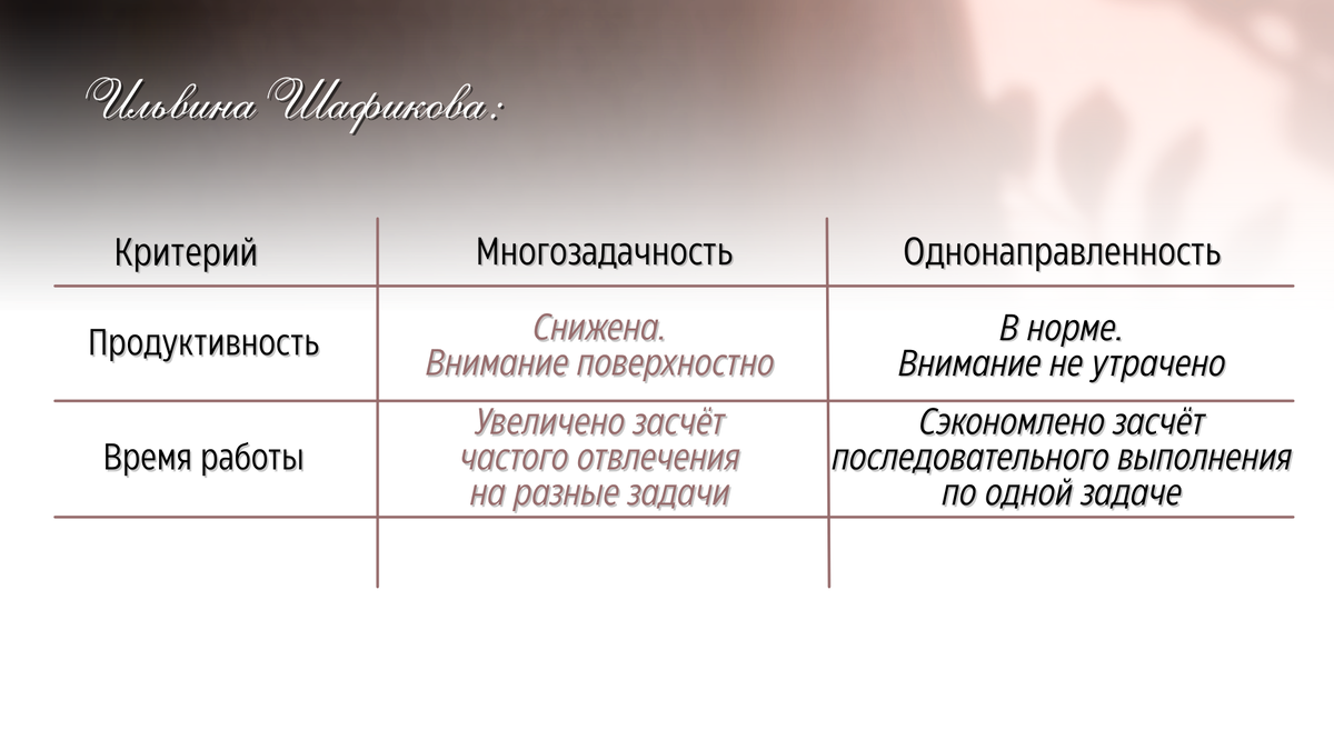 Может создаться впечатление, что выполнение сразу нескольких задач приводит к высоким результатам. Однако в действительности итогом такой многозадачности является снижение продуктивности, выгорание и увольнение. Исследования показывают, что переключение между несколькими задачами требует дополнительного времени (Роберт Роджерс, Стивен Монселл), а если задачи ещё и отличаются по степени сложности, то это время значительно увеличивается (Джошуа Рубинштейн, Джеффри Эванс, Дэвид Мейер). Многозадачность ухудшает концентрацию и память (Клиффорд Насс, Эяль Офир, Энтони Вагнер).