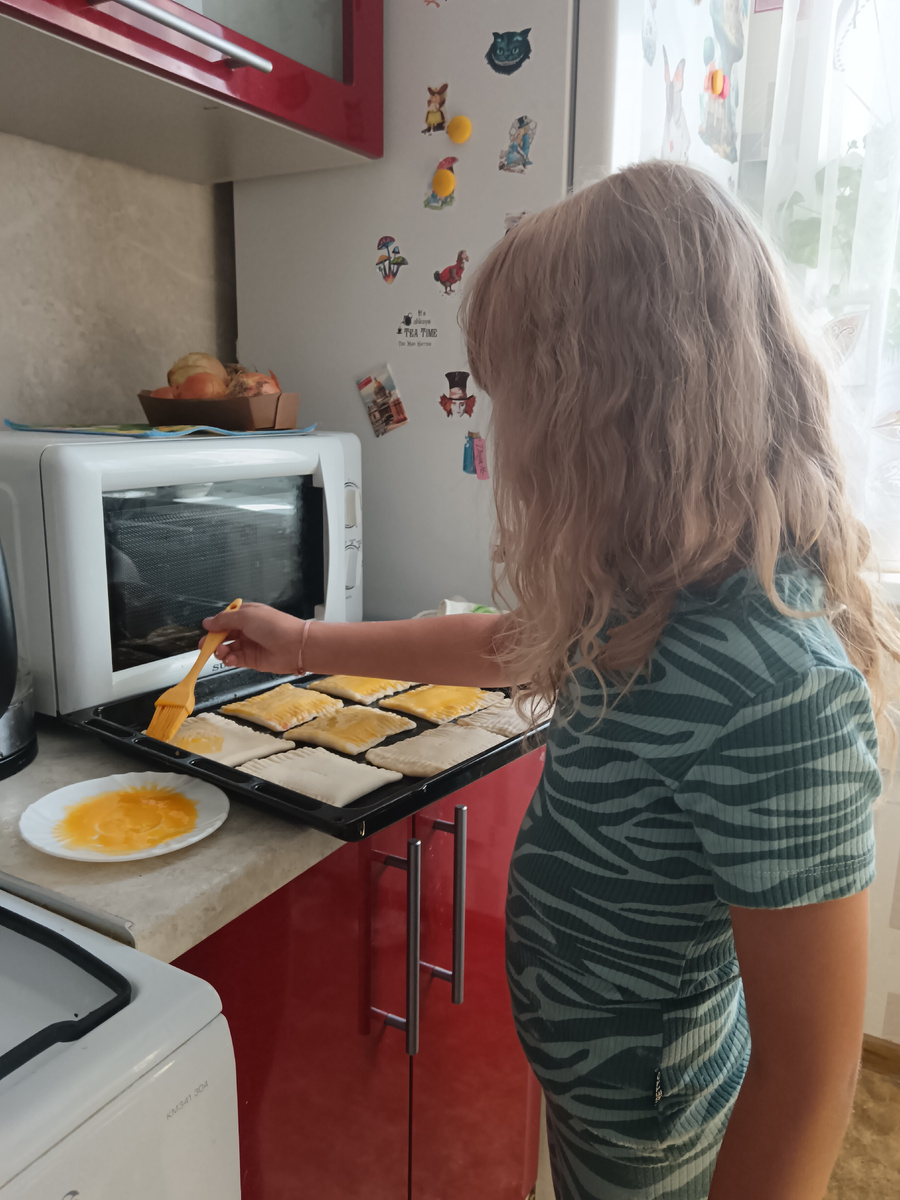 Вчера к обеду подружка наша вернулась из Пекина. Сразу зашла в гости к нам с подарками) Сказала, что очень скучала по Софе и по Соколу. Рассказала нам, как она провела время в Пекине. Очень интересно было позадавать вопросы и слушать её ответы. А сегодня моя дочка решила приготовить вместе с Лерой очередные вкусняшки из Пинтерест или из какой другой сети, неважно. Канал назывался Нефтяник с дочкой или как-то так. Сначала дочка мне показала видео. Коротенькое, но хорошо отмонтированное. Там папа с дочкой готовили конвертики из слоёного теста с вишнёвым джемом. Заказала я им слоёного теста из 5ки. За клубничным джемом они сбегали к нашей бабушке, к моей маме. К обеду я снова села в кресло. Поехала на кухню. Под моим присмотром девочки принялись за дело 👩🍳👩🍳 Слоёное тесто ещё не полностью разморозилось, пока они ходили к бабушке за джемом. Дочка моя, сначала его взяла, начала разматывать и рвать руками. Пришлось её громко остановить и объяснить, что слоёное тесто-это не дрожжевое. Ч