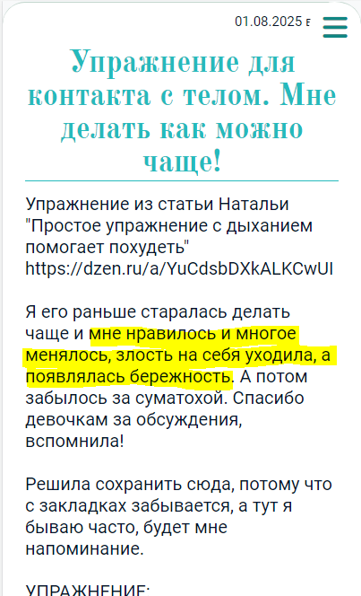 А если контакт с телом вызывает сопротивление, отторжение, то, возможно, внутри живёт боль, которая не хочет быть обнаруженной. Тогда можно мягко разбираться в ситуации по плану, который описала на странице "7 шагов к стройности".