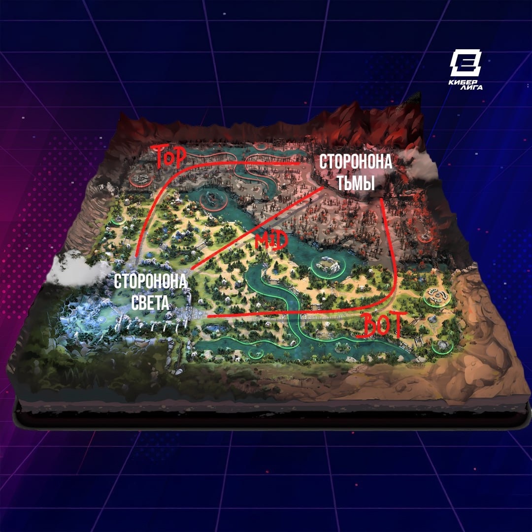 ✦ Карта Dota 2 - это боевое поле размером примерно 11x11, разделённое на две части: сторону Света (Radiant) и сторону Тьмы (Dire). ✦ Основные элементы карты: Башни (Towers) ✦ Башни стоят на трёх линиях (Top, Mid, Bot) с каждой стороны. ✦ На башни можно телепортироваться с любой точки карты. ✦ Защищают проходы к базе, наносят урон врагам и служат первой линией обороны. ✦ Башни наносят значительный урон и замедляют врагов, поэтому атаковать их нужно с умом. Трон (Ancient) ✦ Расположен в глубине базы каждой команды, за башнями. ✦ Уничтожение трона - победа для команды. Руны (Runes) ✦ Появляются каждые 2 минуты на специальных точках - в реке, ближе к центру карты. Основные виды: ✦ Быстрые руны (Bounty Runes) - дают золото и опыт команде. ✦Силовые руны (Power Runes) - дают временные сильные бонусы (ускорение, невидимость, двойной урон и др.). Алтарь опыта (Experience Runes) ✦Стоят на линии в специальных местах рядом с лесом. ✦ Дают небольшой бонус к опыту, что помогает героям быстрее развив