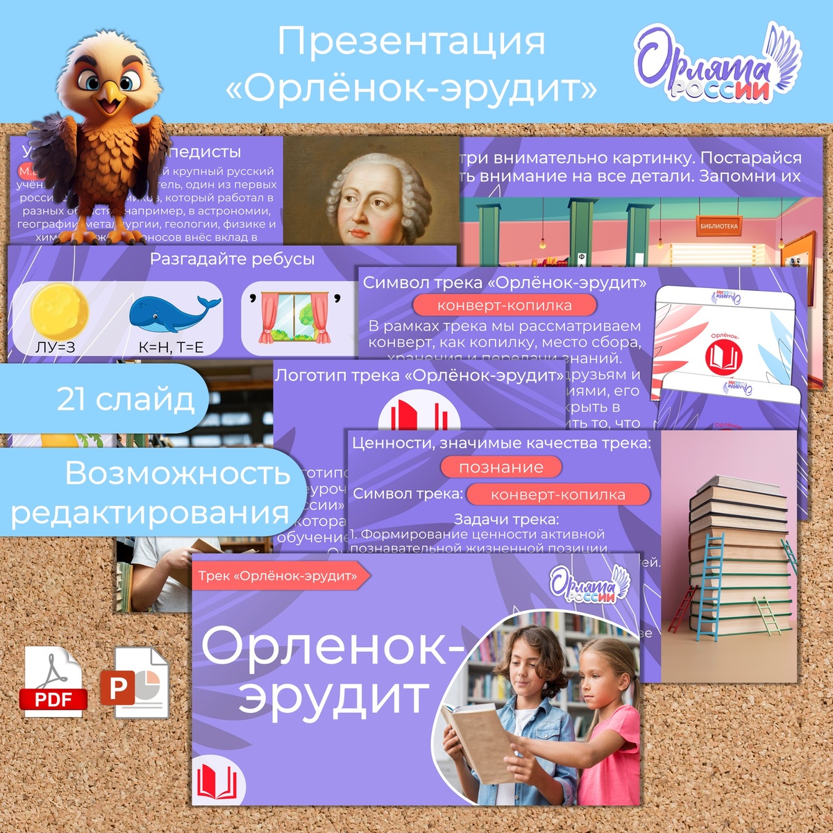 Презентация «Орленок-эрудит» для внеурочной деятельности «Орлята России». Трек «Орленок-эрудит» для обучающихся 1-4 классов. Презентация включает в себя 21 слайд. Помимо теоретической части презентация содержит практические задания. Презентация сопровождается красочными иллюстрациями. Содержится анимация. Содержание: Презентация в формате PPTX и PDF. Есть возможность редактирования.