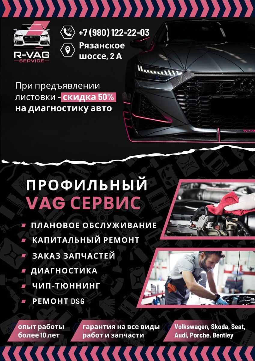 ⚡️ R-VAG — ваш надёжный автосервис для автомобилей VAG! В нашем сервисе обслуживают Audi, VW, Skoda, Seat и Porsche - мы знаем эти машины как свои пять пальцев. Наши мастера имеют стаж более 10 лет, их опыт и профессионализм проверены годами. 🎯 Почему выбирают R-VAG⚫️ ⚫️ Фото и видео отчёты — вы всегда в курсе, что делается с вашим авто ⚫️ Гарантия на работы и запчасти, купленные у нас ⚫️ Гибкие способы оплаты: по счёту, картой через QR-код, наличными ⚫️Честный подход и отсутствие лишних работ ⚫️Современное оборудование и качественные запчасти Доверьте свой VAG-автомобиль профессионалам - мы заботимся о нём так, как вы сами. 👍Добраться до нас (жми) 📞 +7(980)122-22-03 💬 @RVAGservice ⚡️R-VAG - профессиональный автосервис VAG в Люберцах (ЮВАО) #RVAG #обслуживаниеАвто #VAG