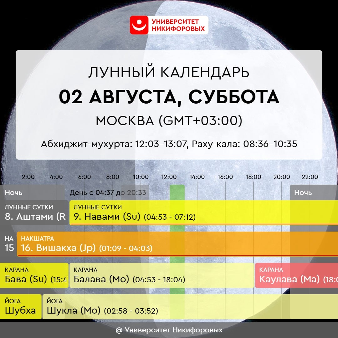 2 АВГУСТА, СУББОТА День смешанных энергий, он подходит для очищения и рутинной деятельности. Начинать новое и важное сегодня не стоит. Успешными будут действия для преодоления препятствий и расчистки завалов. Присущая дню сила очищения тесно связана с женскими энергиями, потому сегодня особенно хорошо обращаться за поддержкой к женским ипостасям божеств, читать молитву Божественной Матери или мантру Дурге. Луна находится в ослабленном положении – наша психика становится более уязвимой, детям может потребоваться наша поддержка и забота в большей степени, чем обычно. Найдите возможность позаботиться и о себе – только когда мы наполнены, мы можем делиться с другими: ванна или продолжительный душ, чашка любимого чая в тишине или несколько минут для медитации дадут необходимый ресурс.