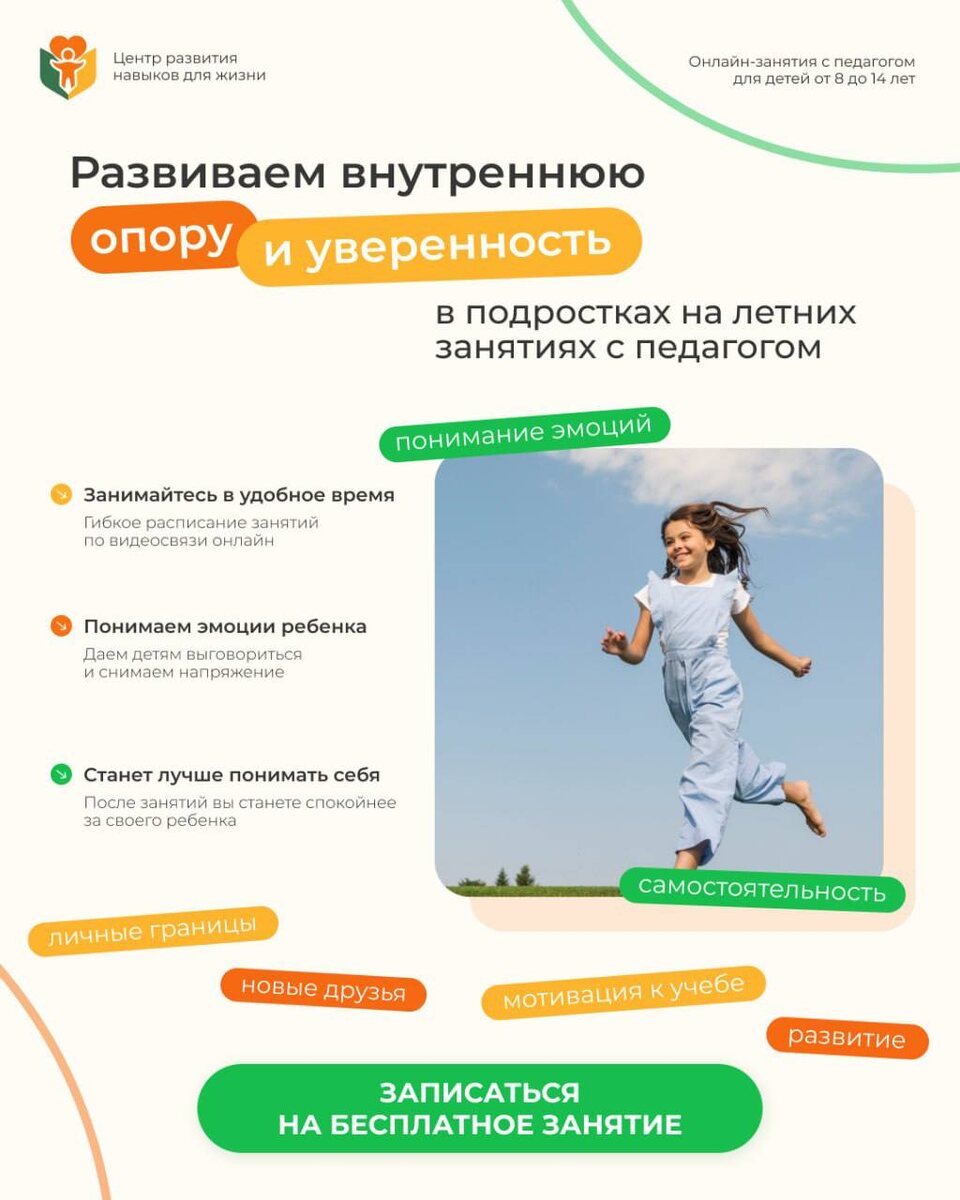 СЕНТЯБРЬ БЛИЗКО Каждый родитель хочет, чтобы ребенок стал увереннее и успешнее! В онлайн Центре мягких навыков детей 8-14 лет мы помогаем вашим детям справиться с эмоциями, гаджетами и плохими оценками! Запишите вашего ребёнка на бесплатное пробное занятие. Просто напишите нашему педагогу в тг @deti_eq_centr или запишитесь по ссылке на сайте👇 https://eqskills.ru/ Я, Римма Финашина, Педагог-психолог с 25-летним стажем проведу занятие, после которого дам вам рекомендации, как раскрыть потенциал ребенка. ЗАПИСАТЬСЯ ЗАПИСАТЬСЯ