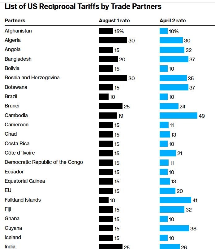 Минимальная ставка тарифа - 10% для всех. А для тех, у кого профицит в торговле с США – 15% и более. Новые ставки вступят в силу в полночь 7 августа. Канады, Мексики и Китая в списке нет - тут еще ведутся переговоры. Для Канады и Мексики эти тарифы не имеют важного значения - большая часть их импорта в США идет под соглашением о свободе торговли между тремя странами, заключенном Трампом во время своего первого срока в Белом Доме с нулевой ставкой. Некоторые страны вообще не беспокоятся о своей ставке. Например, наш сосед, Казахстан, получивший 25%. Правительство страны уверено, что эта ставка распространится на 5-8% экспорта в США. Остальные товары - в списке исключений (нефть сырая, уран, серебро, ферросплавы и др.). Уникальный штраф получила Бразилия. В таблице указано 10%, но Трамп наложил еще дополнительные 40%. Несколько стран получили резкое снижение тарифа со 2 апреля, когда они были впервые объявлены. В основном это те, которые открыли свои рынки для американского импорта по 0%