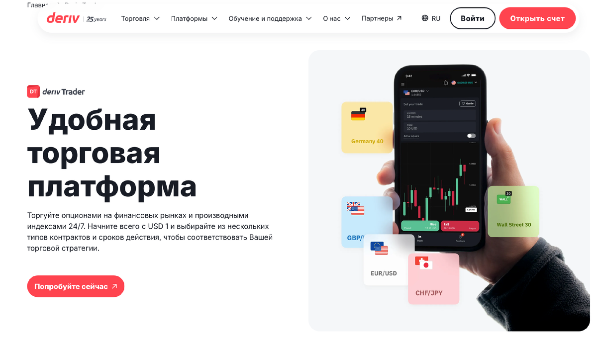 Перейти на сайт и попробовать торговлю без риска на демо счете - ссылка https://track.deriv.be/_6xp8XiG-e6op2TQjw-dn9mNd7ZgqdRLk/1/ Основанная в 1999 году, компания в 2025 году отмечает 25‑летие, обслуживая более 3 млн трейдеров, с месячным оборотом более 33 трлн USD и 187 млн операций ежедневно Deriv предлагает собственные синтетические индексы, которые торгуются 24/7, независимо от реальных рыночных событий. Это криптографически генерируемые активы, которые регулярно проходят внешние аудиты на честность На платформе DTrader можно размещать сделки с продолжительностью всего 1 секунда. Минимальная ставка — от 0.35 USD, что делает её доступной для начинающих Deriv предоставляет четыре основные платформы: Через платформу cTrader Deriv предлагает копирование сделок успешных трейдеров с автоматическим слежением за стратегиями (Strategy Providers). Доступно более 150 активов, торговля круглосуточная для некоторых категорий Deriv предлагает демо-счет с виртуальными $10 000. По некоторым