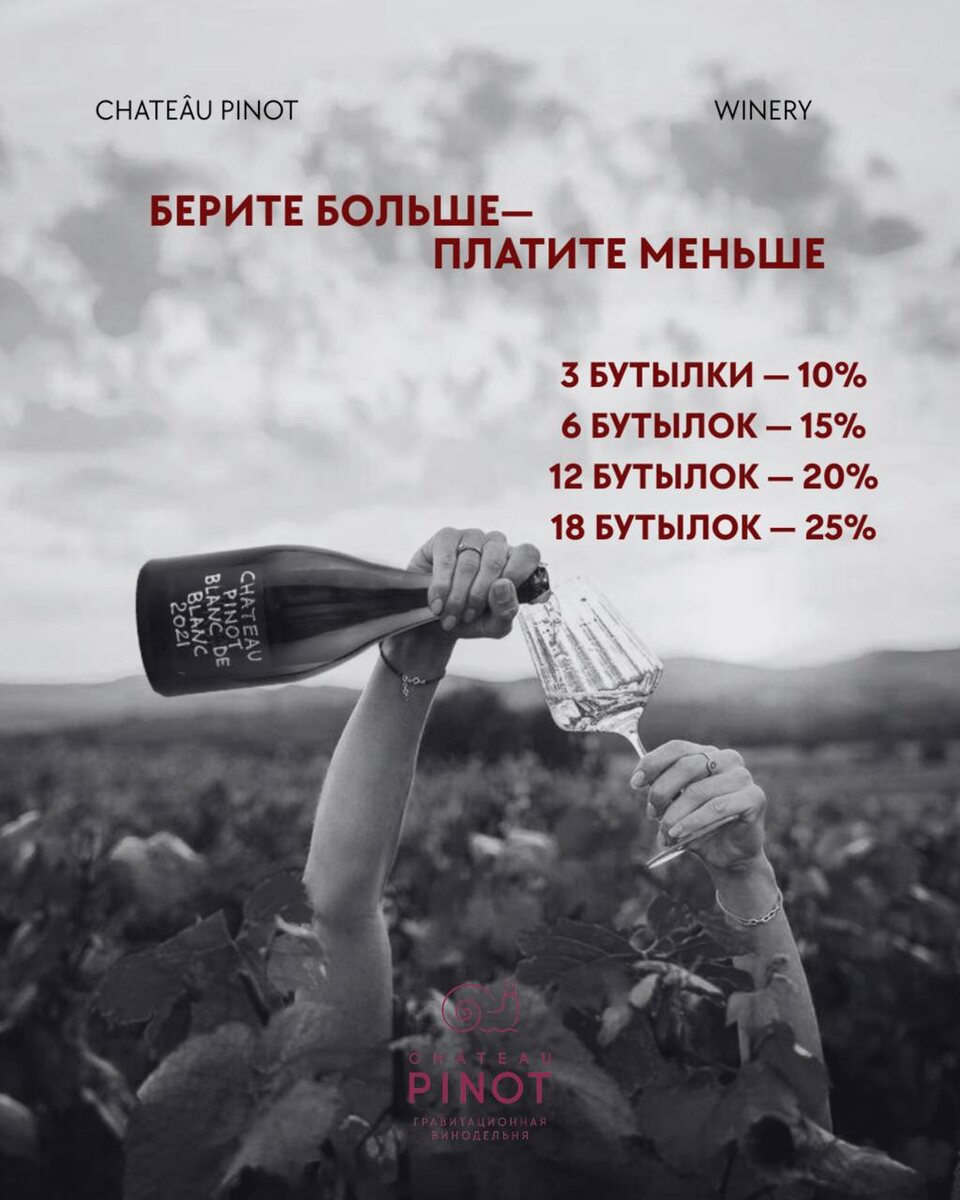 Друзья, у нас отличные новости! Август – время щедрых подарков от Шато Пино! 🥂 Скидки до 25% на все вина в фирменных магазинах. Самое время собрать свой винный шкаф и купить вина в подарок, ведь чем больше вы возьмёте, тем больше будет скидка! — 3 бутылки = 10% скидка на весь чек! — 6 бутылок = 15% скидка – экономьте ощутимо! — 12 бутылок = 20% скидка – идеально для запаса или подарков! — 18 бутылок = 25% скидка – максимальная выгода! Создайте свой идеальный винный запас по лучшей цене! Приходите в наши фирменные магазины на винодельне, в Новороссийске на набережную Адмирала Серебрякова, ½ (на Форумной площади) и в Кабардинке на Сухумском шоссе, 3 км (Казачий курень) Акция действует на все вина Шато Пино! Успейте воспользоваться лучшим предложением лета🥂❤️