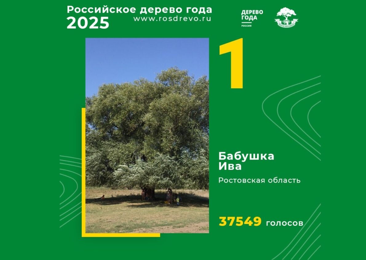 Сегодня стали известны результаты голосования за дерево года-2025. В ежегодном всероссийском конкурсе участвовало более 70 деревьев. Голосование за главное дерево страны проходило на сайте Всероссийской программы «Деревья – памятники живой природы». От нашей области была предложена к участию в конкурсе огромная ива, которая растёт в Белокалитвинском районе, на окраине маленького хутора Дубового с населением около 200 человек, на берегу реки Кундрючьей. Диаметр кроны дерева – 25 метров. Ствол дерева внизу закручивается против часовой стрелки и разветвляется на три на уровне человеческого роста, образуя уютное местечко, куда любят забираться дети. Судя по высоте дерева и кроне, ему не менее 100 лет – не зря местные жители прозвали его «бабушкой Ивой». «Бабушка Ива» имеет статус памятника живой природы. Однако есть легенда, что дерево это довольно молодое. Местные жители рассказывают, что совсем недавно, в 1986 году, было наводнение, затопившее всю долину реки, и на это место принесло вет