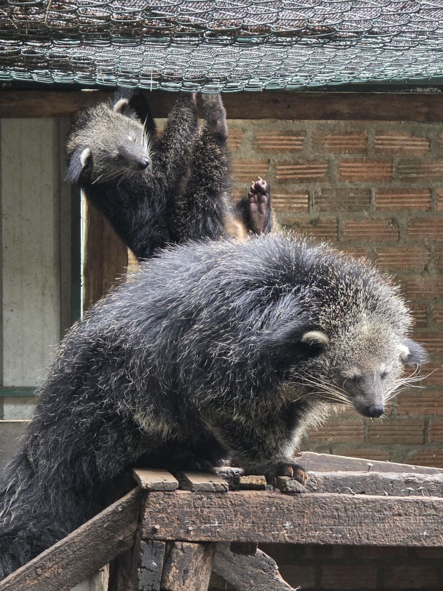 Битуронг - Медеведекот! Если для обсуждения за чашкой кофе потребуется ещё тема для обсуждения, то ловите - медеведекот (или, если официально, битуронг) Не знаю как вы, но я не могу выговорить ме-две-де-кот 😁 и при этом не засмеяться - настолько смешное это слово и сами зверьки (они кстати родственники люваков, но больше; если лювак с обычную собаку, то медведекот 😹 размером с размером с крупную собаку) Они очень милые и кажется, что и еще задумчивые! Например тот, что на фото поменьше, сначала смотрел на меня удивлённым взглядом, типа "Что уставился ? Сейчас подойду и укушу ю! Или передумаю!" А потом действительно передумал и решил повисеть на хвосте (кстати это единственные, кроме обезьян, животные в Евразии, которые на это способны! К сожалению, близость люваков и обилие зерен в процессе производства не позволила проверить ещё один факт медеведекотов (ахах, 🤭как же это смешно звучит!) - говорят, что они пахнут карамелью и попкорном! И кроме этого, они ещё могут разверн