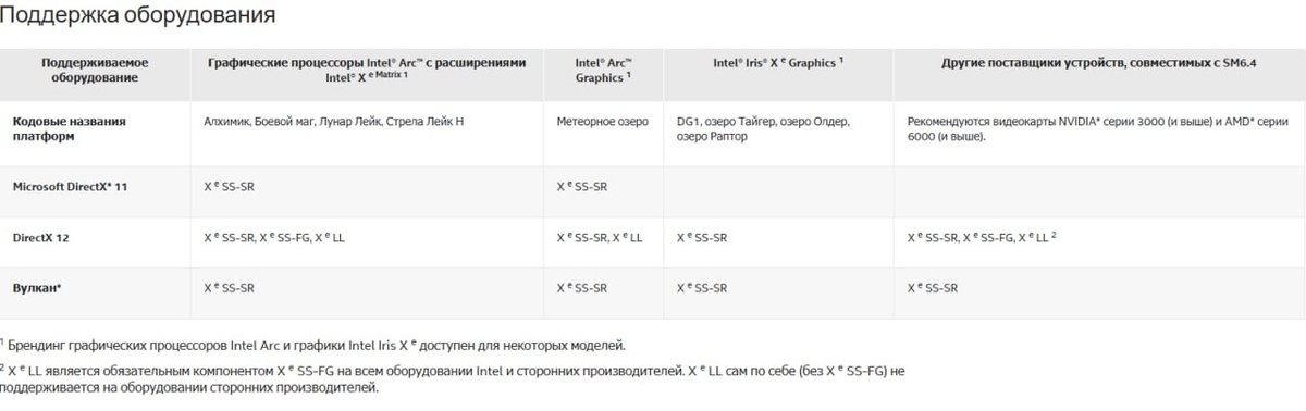 Intel выпустила SDK XeSS 2.1.0 — комплект разработки с поддержкой видеокарт AMD и NVIDIA, начиная с Radeon RX 5000 и GeForce GTX 10 (рекомендуются RX 6000 и RTX 30), при наличии поддержки Shader Model 6.4. Технология снижения задержки XeLL встроена в систему генерации кадров XeSS и не может использоваться отдельно на видеокартах AMD и NVIDIA — только вместе с генерацией кадров.