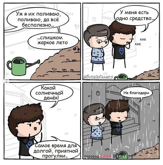 А вы любите дождь? Когда я сам задумался над этим вопросом, понял, что однозначного ответа у меня нет. Когда дождик мерно шумит за окном, а у меня есть возможность ещё поваляться в кровати – конечно, да! Или когда в июльский зной вдруг набегают тучки, и мелкие капли приятно освежают тело – тоже кайф. А иногда и мрачной осенью мне нравится немного побродить под дождём. Но я совершенно точно не люблю дождь, когда он расстраивает мои планы. И уж совсем неприятно, когда ливни не прекращаются неделю или больше. Да, дождь прекрасный пример того, что всё в нашей жизни относительно. Отражено это и в комиксов, которые я сегодня для вас подобрал.