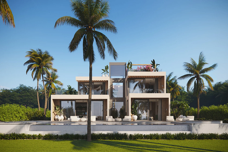 Golden Island Villa is a tropical luxury retreat designed to harmonize architecture with paradise. Surrounded by lush palms and offering panoramic ocean views, this modern beachfront villa features clean cubic forms, expansive terraces, and a rooftop oasis blooming with bougainvillea. The signature design elements include an infinity-edge pool with a sunken lounge, rooftop pergolas, and seamless indoor-outdoor flow through floor-to-ceiling glass walls. Ideal for luxury living, private events, or high-end vacation rental, Golden Island Villa combines contemporary elegance with exotic serenity — just steps from the beach.