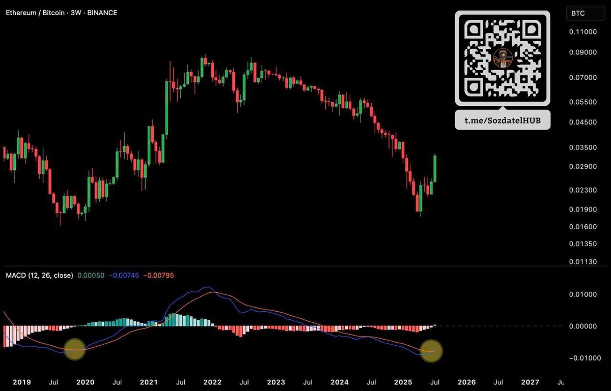 Впервые с 2019 года индикатор MACD показывает устойчивый бычий сигнал для эфира по отношению к биткоину на трёхнедельном графике