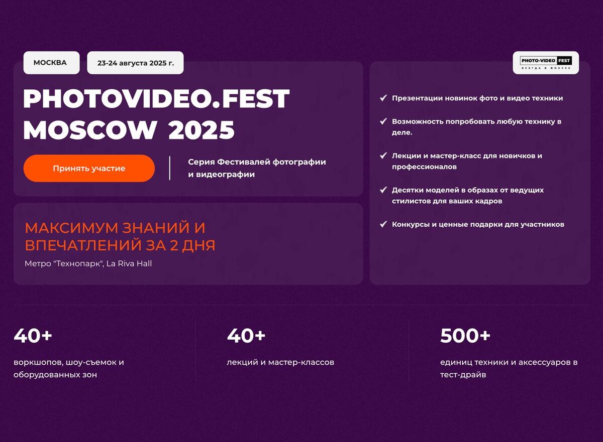 Друзья! С 1 по 10 августа можно купить билеты на главный и самый большой Фестиваль-форум фотографов, создателей контента и операторов со скидкой - количество билетов в этом году ограничено - всего 10 000. Это было тяжелое решение, но мы за качество и доступность для каждого. Особенно на съемках - сотни моделей в образах уже готовятся. Так что спешите! Moscow.PhotoVideoFest.ru - тысячи фотографов уже забрали билеты. А почему этого еще не сделали вы? Пропускать запрещено. PS В гостиницах рядом с Фестивалем уже почти нет мест. Не затягивайте с билетами в Москву. Лучше прилетать за день - много задержек рейсов. Мест в самолетах и поездах не всегда хватает именно на даты Фестиваля. Поэтому берите все заранее! Особенно кто летит из Казахстана, Беларуси - рейсов сейчас не так много, как обычно. Для участников из Европы, Китая и США - выбирайте пересадочные рейсы в Турции - так удобней добираться. Позабодьтесь о визах заранее. Времени уже совсем мало. Билеты со скидкой эксклюзивно в нашем ск