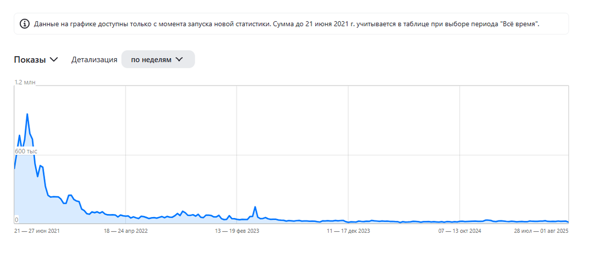 Буду рассказывать на примере тёмной стороны, с которой я не ушла. Почему на её примере? Потому что там всегда были показатели в разы выше, чем здесь. В разы — это не в два-три, а в пять-десять. Итак, погнали. Видите цифры на графике ниже? Статистика доступна только с лета 2021, это уже после очередного падения. Это показы. Столько раз за неделю алгоритм показывает публикации. Едем дальше. Вот так обстояли дела с теми статьями, которые которые, как это принято говорить «залетали» или «выстреливали». Показы по полмиллиона, по миллиону. Было и больше, но я выставила фильтр по дочитываниям. А это я сделала выборку по случайному ключевому слову. Это то, что «не выстрелило». Десятки тысяч показов тогда были провалом. Поехали дальше. Поглядим, а что же сейчас. А сейчас 211 показов на статью, 810... Пирожки всегда любят. Это самые «выстрелившие» материалы июля. От шести тысяч до двух