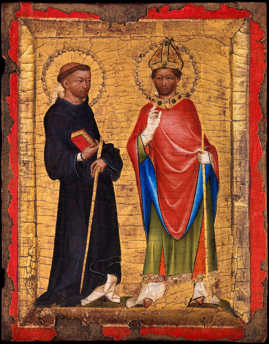 Перед нами картина неизвестного чешского художника XIV века. Она была частью серии из двух соединенных деревянных панелей, которая использовалась для частных молитв. На этой изображены два чешских святых (Богемия — современная Чешская Республика). — Монах слева — святой Прокопий Сазавский (970–1053), бенедиктинский каноник, удалившийся в пустыню и живший отшельником. Там его обнаружил местный герцог Ульрих. После того, как Прокопий превратил воду Ульриха в вино, герцог разрешил Прокопию построить монастырь, и Прокопий стал его первым настоятелем. Прокопий — (неофициальный) святой покровитель Богемии. — Епископ справа — Адальберт Пражский (956–997). Адальберт был вторым епископом Праги и основал монастырь в Бржевнове, первый монастырь на территории Чехии. Адальберт также был миссионером, отправившимся в Пруссию, где в конце концов был убит язычниками-пруссами. За это Адальберт также известен как "апостол пруссов" и является святым покровителем Чехии, Польши, Венгрии и бывшего гос