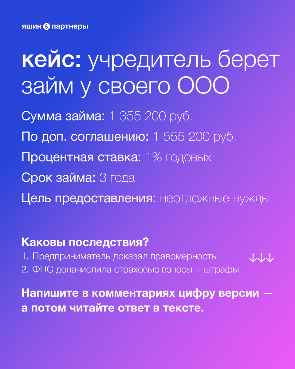 Напишите, какой вариант развития событий случился по вашему мнению — а потом читайте пост. ⬇️ Реальный кейс, который дошел до суда с налоговой и разрешился только под конец 2024 года. Учредитель и гендир взял у своего же ООО займ, прикрываясь неотложными нуждами. По результатам дела ФНС доначислила страховые взносы + штраф, установив факт, что предприниматель избежал таким образом уплаты налогов по страховым взносам — и не отразил их в расчетах. Деньги, которые были перечислены под видом заемных, признали скрытой формой оплаты труда. Штраф: 23 000 руб.